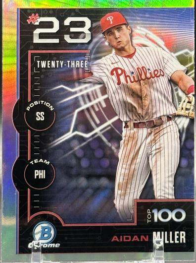 Carta oficial de la colección 2025 Bowman Scouts Top 100 del joven prospecto Aidan Miller de los Philadelphia Phillies. Número de tarjeta #BTP-23